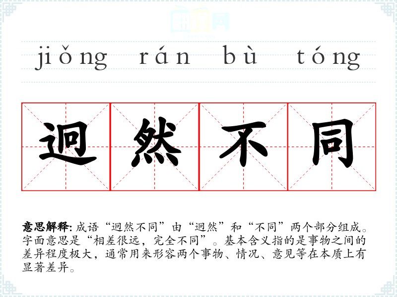 成语“迥然不同”由“迥然”和“不同”两个部分组成。字面意思是“相差很远,完全不同”。基本含义指的是事物之间的差异程度极大,通常用来形容两个事物、情况、意见等在本质上有显著差异。
