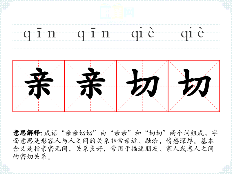 成语“亲亲切切”由“亲亲”和“切切”两个词组成。字面意思是形容人与人之间的关系非常亲近、融洽,情感深厚。基本含义是指亲密无间,关系良好,常用于描述朋友、家人或恋人之间的密切关系。
