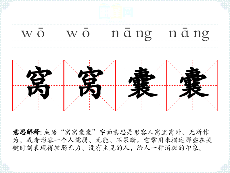 成语“窝窝囊囊”字面意思是形容人窝里窝外、无所作为,或者形容一个人懦弱、无能、不果断。它常用来描述那些在关键时刻表现得软弱无力、没有主见的人,给人一种消极的印象。