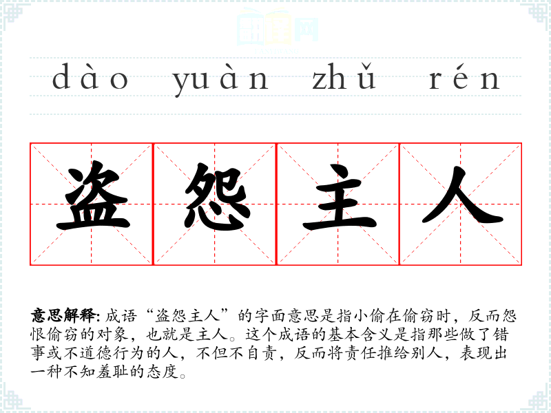 成语“盗怨主人”的字面意思是指小偷在偷窃时,反而怨恨偷窃的对象,也就是主人。这个成语的基本含义是指那些做了错事或不道德行为的人,不但不自责,反而将责任推给别人,表现出一种不知羞耻的态度。