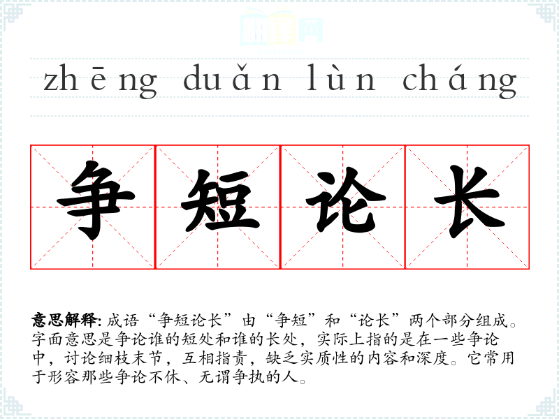 成语“争短论长”由“争短”和“论长”两个部分组成。字面意思是争论谁的短处和谁的长处,实际上指的是在一些争论中,讨论细枝末节,互相指责,缺乏实质性的内容和深度。它常用于形容那些争论不休、无谓争执的人。