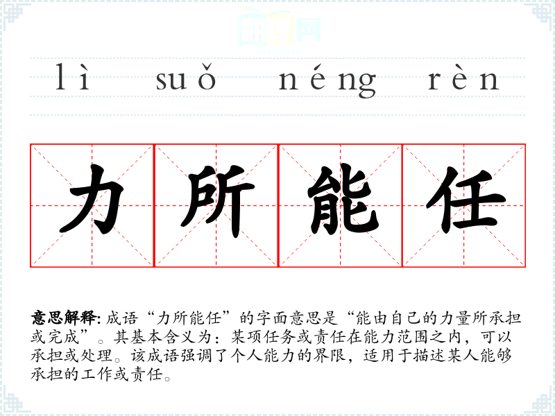 成语“力所能任”的字面意思是“能由自己的力量所承担或完成”。其基本含义为:某项任务或责任在能力范围之内,可以承担或处理。该成语强调了个人能力的界限,适用于描述某人能够承担的工作或责任。