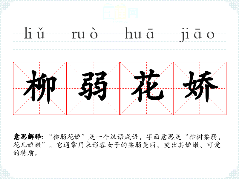 “柳弱花娇”是一个汉语成语,字面意思是“柳树柔弱,花儿娇嫩”。它通常用来形容女子的柔弱美丽,突出其娇嫩、可爱的特质。
