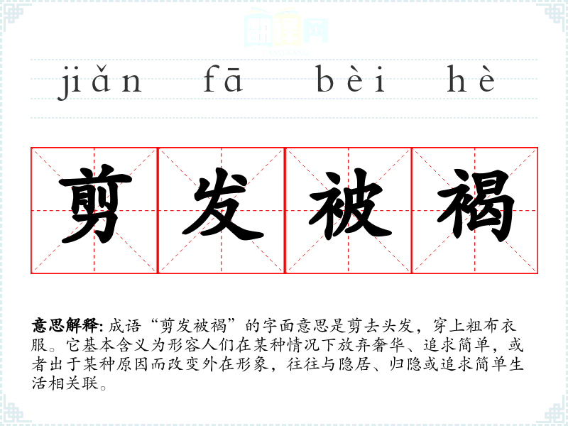 “剪发被褐”出自《汉书·王莽传》,原文是描述王莽在成为平民后,剪去长发,穿上粗布衣服,以示自己已放弃权位,归隐于民。这个成语反映了古人对于隐逸生活的向往以及对简约生活的追求。