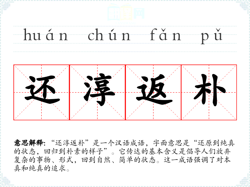 | 返朴还淳 | 返:返回,还。朴:朴实。淳:诚实,厚道。指恢复原始的诚实和朴实厚道的社会风气。 |
