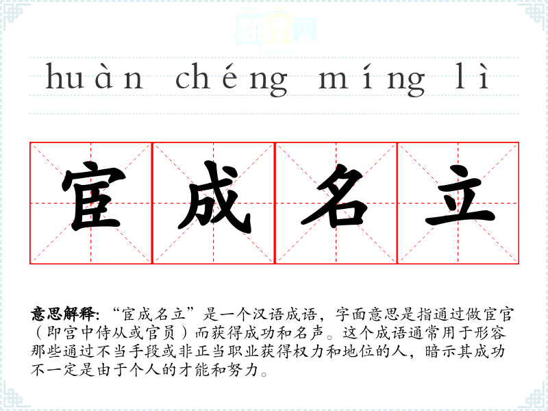 “宦成名立”是一个汉语成语,字面意思是指通过做宦官(即宫中侍从或官员)而获得成功和名声。这个成语通常用于形容那些通过不当手段或非正当职业获得权力和地位的人,暗示其成功不一定是由于个人的才能和努力。