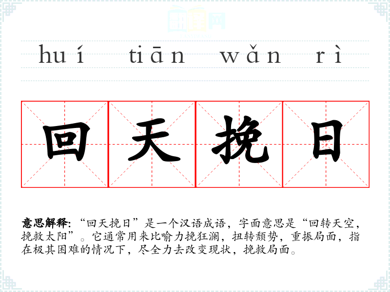 “回天挽日”是一个汉语成语,字面意思是“回转天空,挽救太阳”。它通常用来比喻力挽狂澜,扭转颓势,重振局面,指在极其困难的情况下,尽全力去改变现状,挽救局面。