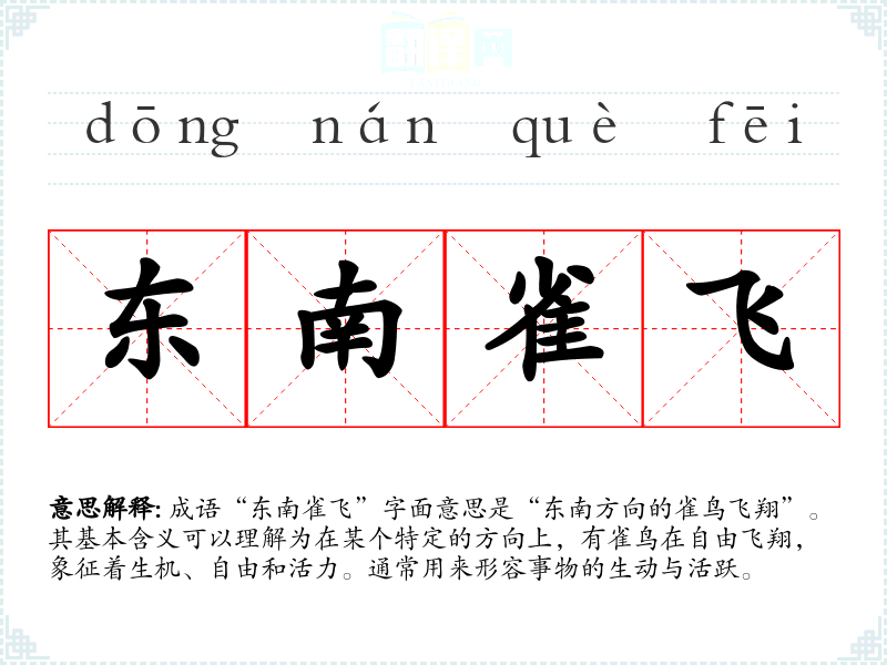 成语“东南雀飞”字面意思是“东南方向的雀鸟飞翔”。其基本含义可以理解为在某个特定的方向上,有雀鸟在自由飞翔,象征着生机、自由和活力。通常用来形容事物的生动与活跃。