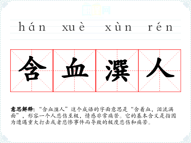 “含血潠人”这个成语的字面意思是“含着血,泪流满面”,形容一个人悲伤至极,情感非常痛苦。它的基本含义是指因为遭遇重大打击或者悲惨**而导致的极度悲伤和痛苦。