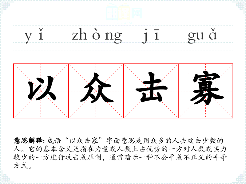 成语“以众击寡”字面意思是用众多的人去攻击少数的人。它的基本含义是指在力量或人数上占优势的一方对人数或实力较少的一方进行攻击或压制,通常暗示一种不公平或不正义的斗争方式。