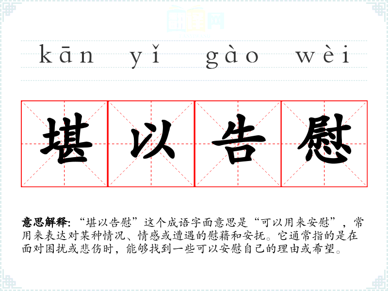 “堪以告慰”这个成语字面意思是“可以用来安慰”,常用来表达对某种情况、情感或遭遇的慰藉和安抚。它通常指的是在面对困扰或悲伤时,能够找到一些可以安慰自己的理由或希望。