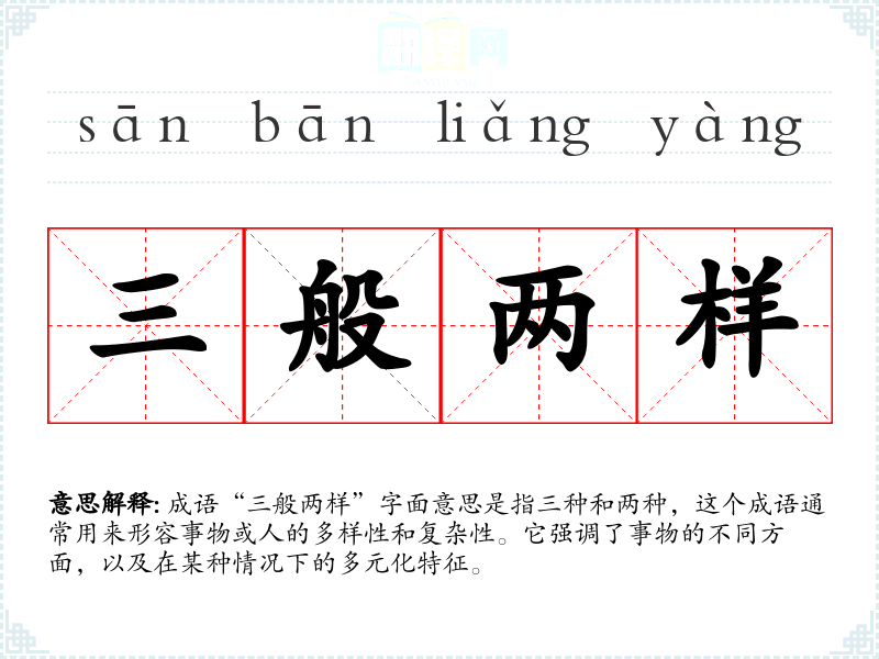 成语“三般两样”字面意思是指三种和两种,这个成语通常用来形容事物或人的多样性和复杂性。它强调了事物的不同方面,以及在某种情况下的多元化特征。