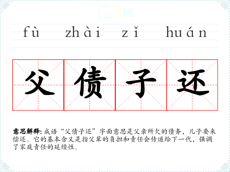 成语“父债子还”字面意思是父亲所欠的债务,儿子要来偿还。它的基本含义是指父辈的负担和责任会传递给下一代,强调了家庭责任的延续性。