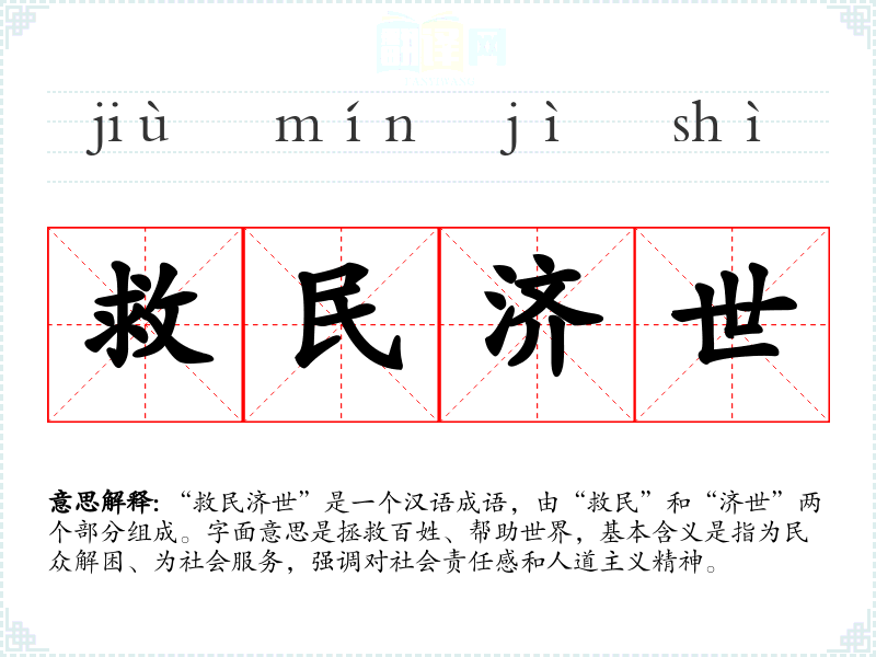 “救民济世”是一个汉语成语,由“救民”和“济世”两个部分组成。字面意思是拯救百姓、帮助世界,基本含义是指为民众解困、为社会服务,强调对社会责任感和人道主义精神。