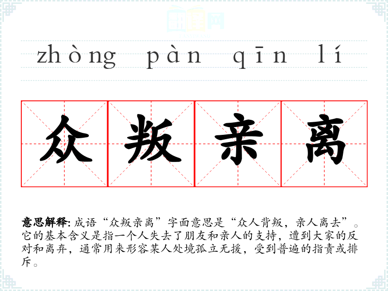 成语“众叛亲离”字面意思是“众人背叛,亲人离去”。它的基本含义是指一个人失去了朋友和亲人的支持,遭到大家的反对和离弃,通常用来形容某人处境孤立无援,受到普遍的指责或排斥。