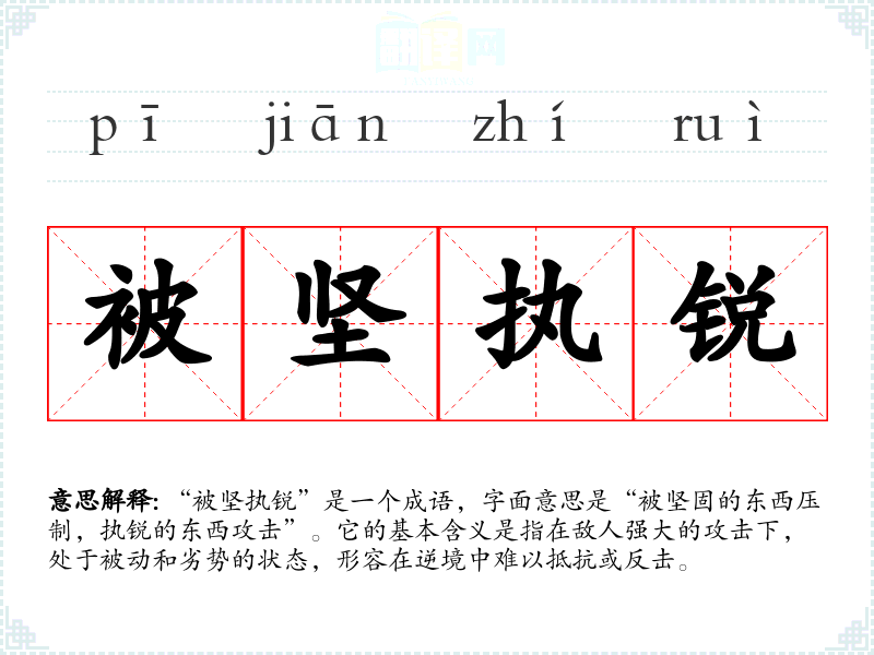 “被坚执锐”是一个成语,字面意思是“被坚固的东西压制,执锐的东西攻击”。它的基本含义是指在敌人强大的攻击下,处于被动和劣势的状态,形容在逆境中难以抵抗或反击。