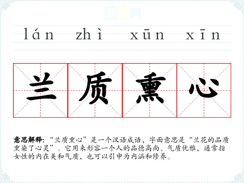 “兰质熏心”是一个汉语成语,字面意思是“兰花的品质熏染了心灵”。它用来形容一个人的品德高尚、气质优雅,通常指女性的内在美和气质,也可以引申为内涵和修养。