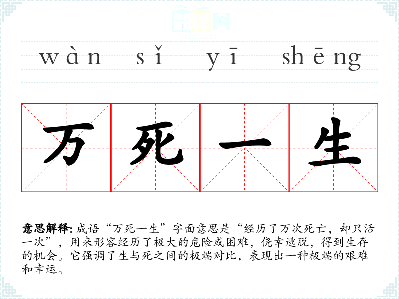 成语“万死一生”字面意思是“经历了万次死亡,却只活一次”,用来形容经历了极大的危险或困难,侥幸逃脱,得到生存的机会。它强调了生与死之间的极端对比,表现出一种极端的艰难和幸运。