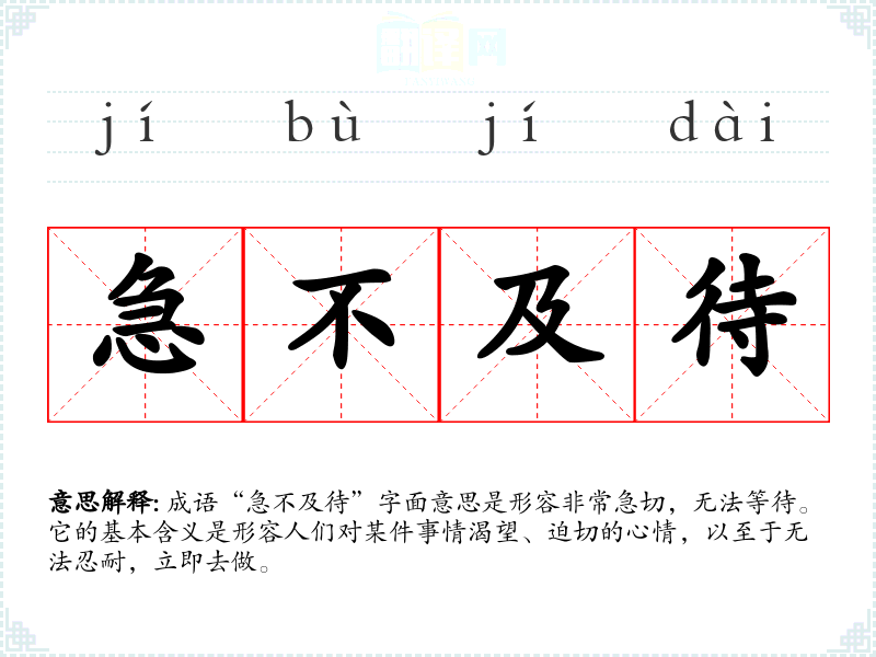 成语“急不及待”字面意思是形容非常急切,无法等待。它的基本含义是形容人们对某件事情渴望、迫切的心情,以至于无法忍耐,立即去做。