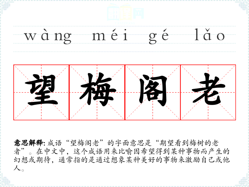 成语“望梅阁老”的字面意思是“期望看到梅树的老者”。在中文中,这个成语用来比喻因希望得到某种事物而产生的幻想或期待,通常指的是通过想象某种美好的事物来激励自己或他人。