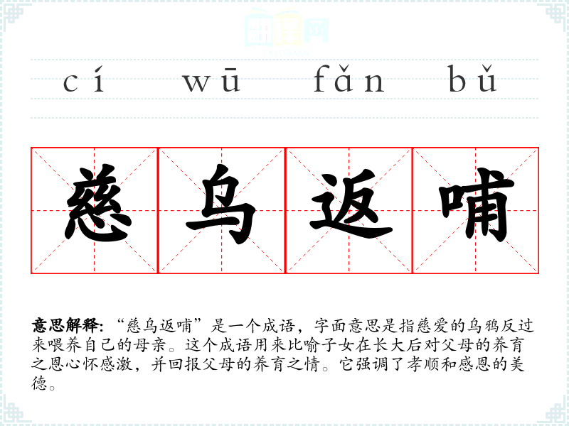 | 慈乌反哺 | 慈:奉养;慈乌:乌鸦的一种,相传能反哺其母;返哺:乌雏长大,衔食哺其母。比喻子女报答父母的养育之恩。 |