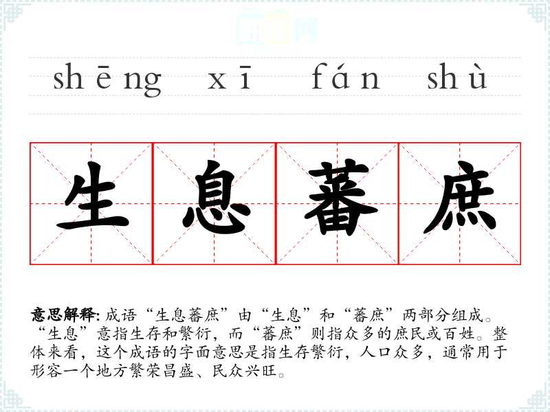 成语“生息蕃庶”由“生息”和“蕃庶”两部分组成。“生息”意指生存和繁衍,而“蕃庶”则指众多的庶民或百姓。整体来看,这个成语的字面意思是指生存繁衍,人口众多,通常用于形容一个地方繁荣昌盛、民众兴旺。