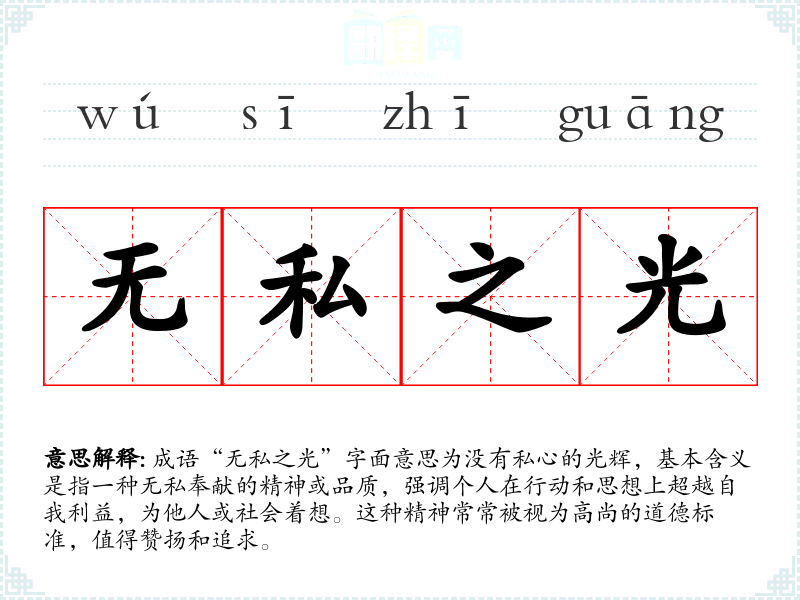 “无私之光”并不是一个传统的成语,而是一个现代的表达,可能受到“无私”和“光辉”这两个词的影响而形成的。它传达的理念与许多文化中提倡的无私精神相契合,尤其是在儒家文化中,强调个人为集体、为他人服务的价值观。