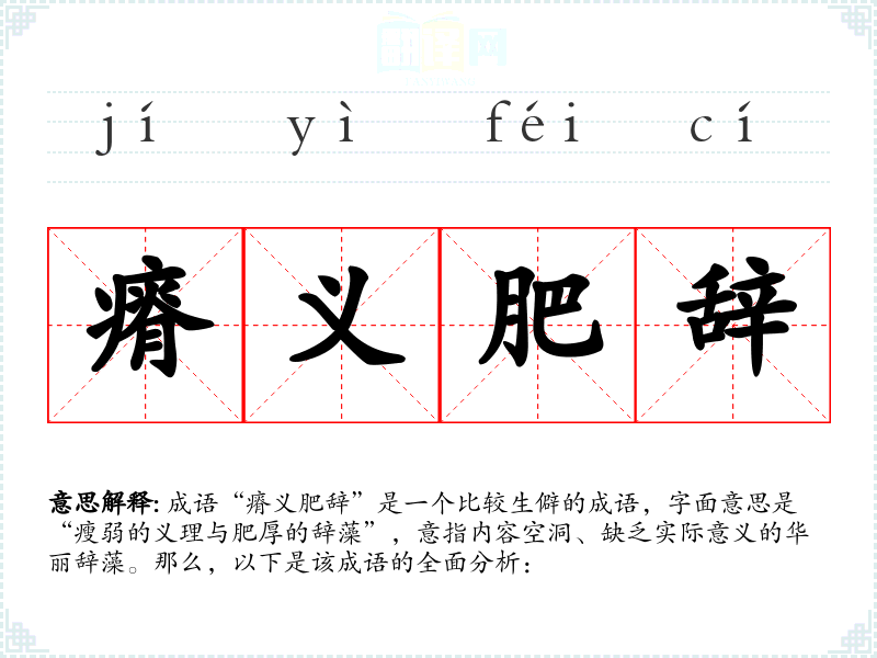成语“瘠义肥辞”是一个比较生僻的成语,字面意思是“瘦弱的义理与肥厚的辞藻”,意指内容空洞、缺乏实际意义的华丽辞藻。那么,以下是该成语的全面分析: