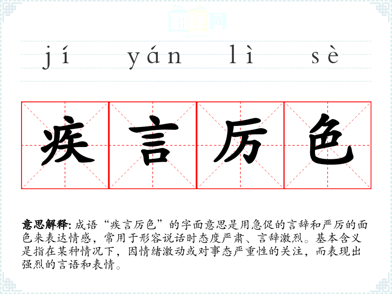 成语“疾言厉色”的字面意思是用急促的言辞和严厉的面色来表达情感,常用于形容说话时态度严肃、言辞激烈。基本含义是指在某种情况下,因情绪激动或对事态严重性的关注,而表现出强烈的言语和表情。