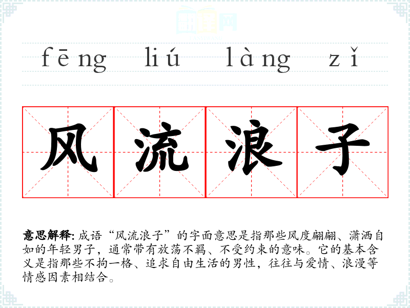 成语“风流浪子”的字面意思是指那些风度翩翩、潇洒自如的年轻男子,通常带有放荡不羁、不受约束的意味。它的基本含义是指那些不拘一格、追求自由生活的男性,往往与爱情、浪漫等情感因素相结合。