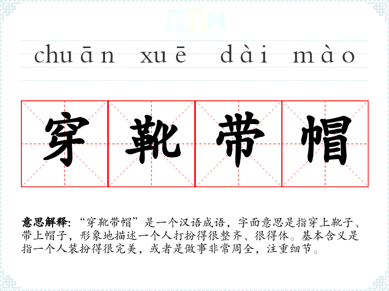 “穿靴带帽”是一个汉语成语,字面意思是指穿上靴子、带上帽子,形象地描述一个人打扮得很整齐、很得体。基本含义是指一个人装扮得很完美,或者是做事非常周全,注重细节。
