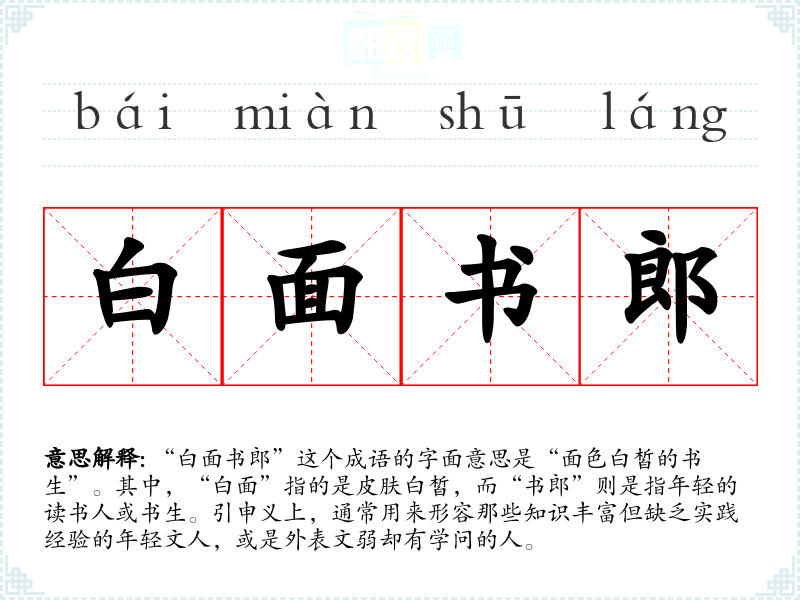 “白面书郎”这个成语的字面意思是“面色白皙的书生”。其中,“白面”指的是皮肤白皙,而“书郎”则是指年轻的读书人或书生。引申义上,通常用来形容那些知识丰富但缺乏实践经验的年轻文人,或是外表文弱却有学问的人。