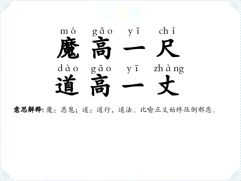 魔:恶鬼;道:道行,道法。比喻正义始终压倒邪恶。 |