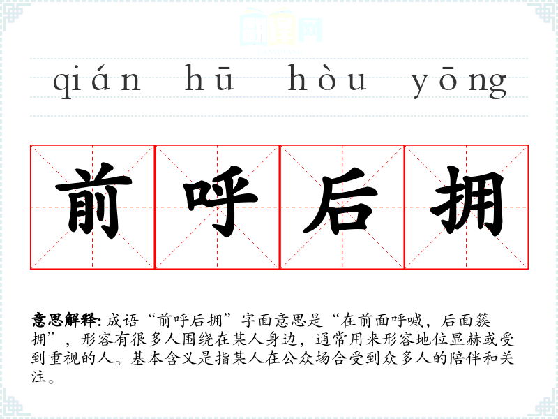 成语“前呼后拥”字面意思是“在前面呼喊,后面簇拥”,形容有很多人围绕在某人身边,通常用来形容地位显赫或受到重视的人。基本含义是指某人在公众场合受到众多人的陪伴和关注。