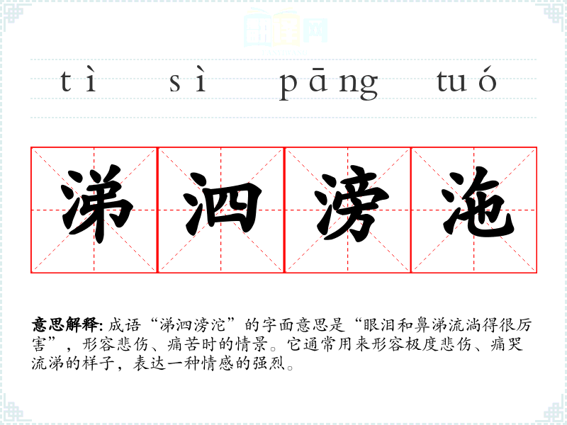 成语“涕泗滂沱”的字面意思是“眼泪和鼻涕流淌得很厉害”,形容悲伤、痛苦时的情景。它通常用来形容极度悲伤、痛哭流涕的样子,表达一种情感的强烈。