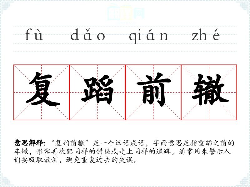 该成语的来源可追溯到古代的文学作品,尤其是《史记》等历史文献中有相关描述。成语中的“前辙”指的是前车留下的车辙,形象地比喻过去的错误和失败。历史上,有许多典故涉及到因重复错误而导致的失败,进一步巩固了这一成语的语义。