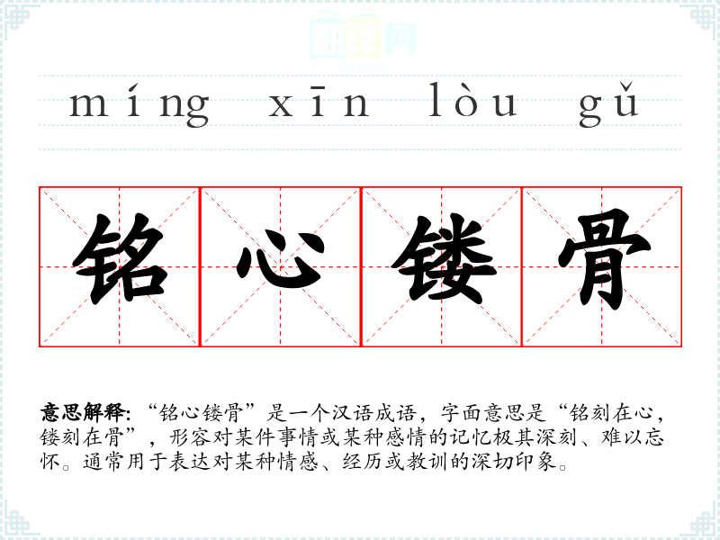 “铭心镂骨”是一个汉语成语,字面意思是“铭刻在心,镂刻在骨”,形容对某件事情或某种感情的记忆极其深刻、难以忘怀。通常用于表达对某种情感、经历或教训的深切印象。