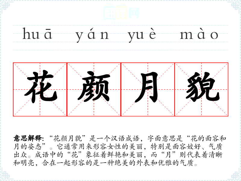 “花颜月貌”是一个汉语成语,字面意思是“花的面容和月的姿态”。它通常用来形容女性的美丽,特别是面容姣好、气质出众。成语中的“花”象征着鲜艳和美丽,而“月”则代表着清晰和明亮,合在一起形容的是一种绝美的外表和优雅的气质。