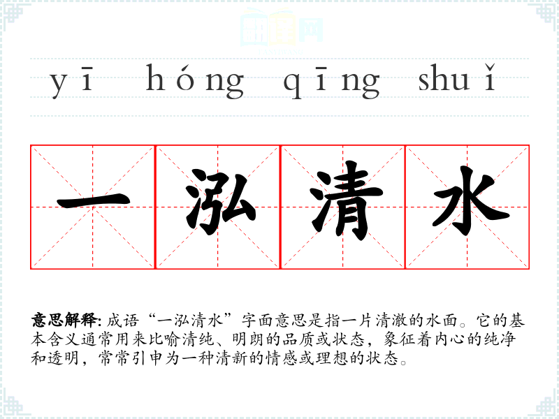 成语“一泓清水”字面意思是指一片清澈的水面。它的基本含义通常用来比喻清纯、明朗的品质或状态,象征着内心的纯净和透明,常常引申为一种清新的情感或理想的状态。