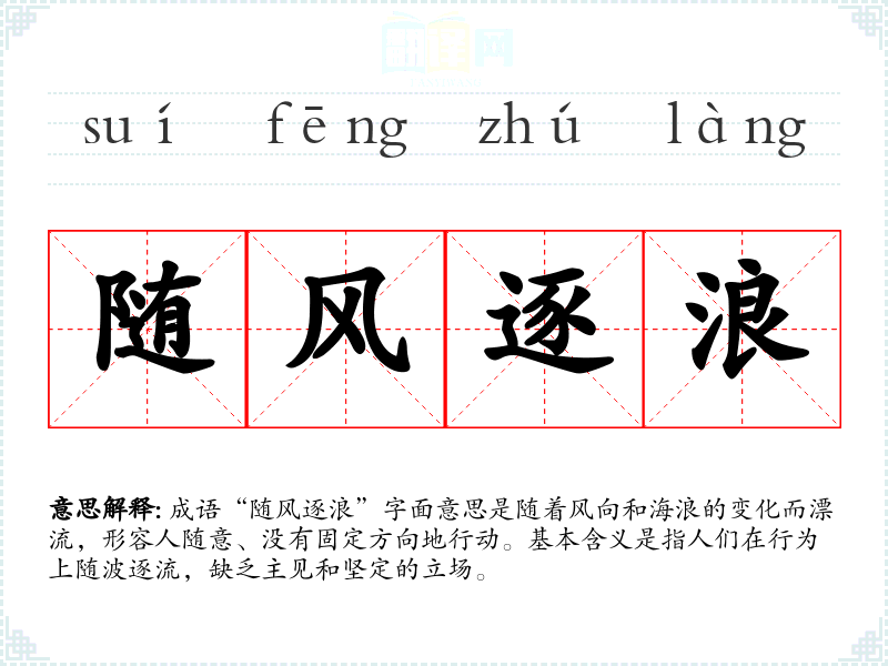 成语“随风逐浪”字面意思是随着风向和海浪的变化而漂流,形容人随意、没有固定方向地行动。基本含义是指人们在行为上随波逐流,缺乏主见和坚定的立场。