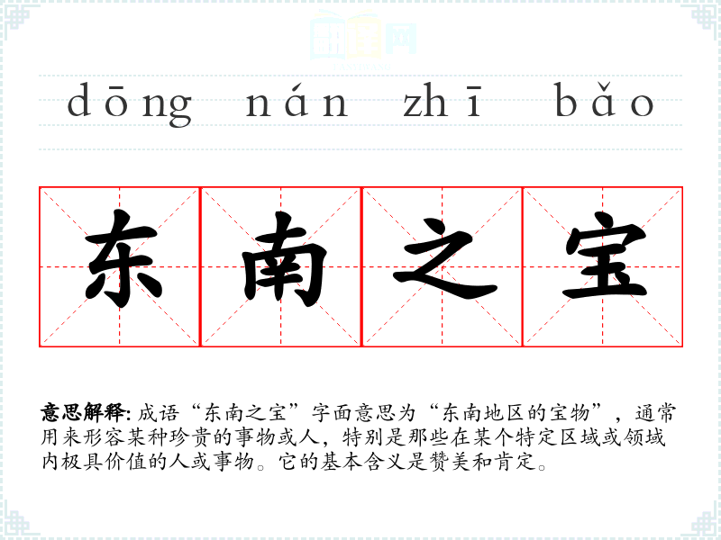 成语“东南之宝”字面意思为“东南地区的宝物”,通常用来形容某种珍贵的事物或人,特别是那些在某个特定区域或领域内极具价值的人或事物。它的基本含义是赞美和肯定。