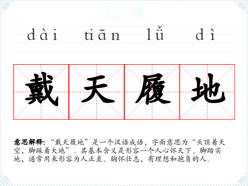 “戴天履地”出自《大元大一统志》,原文为“戴天履地,君子之道也。”成语反映了古代文人对理想人格的追求,强调一个人应当有高尚的志向和扎实的基础。