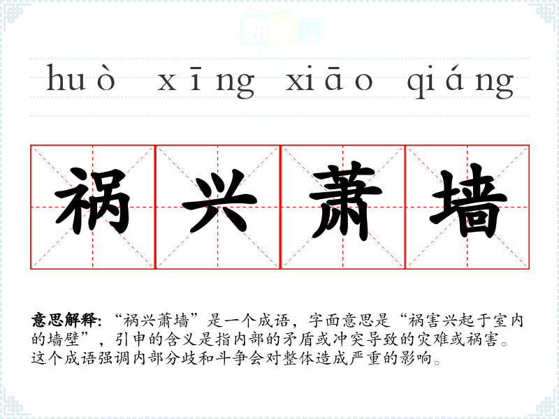 成语“祸兴萧墙”源自《左传》,原文为“祸起萧墙”,意思是灾祸源于内部,强调内部的纷争比外部的威胁更为可怕。萧墙指的是家中墙壁,象征家庭或内部关系,意在说明内部的矛盾和斗争往往比外部的敌人更具破坏性。