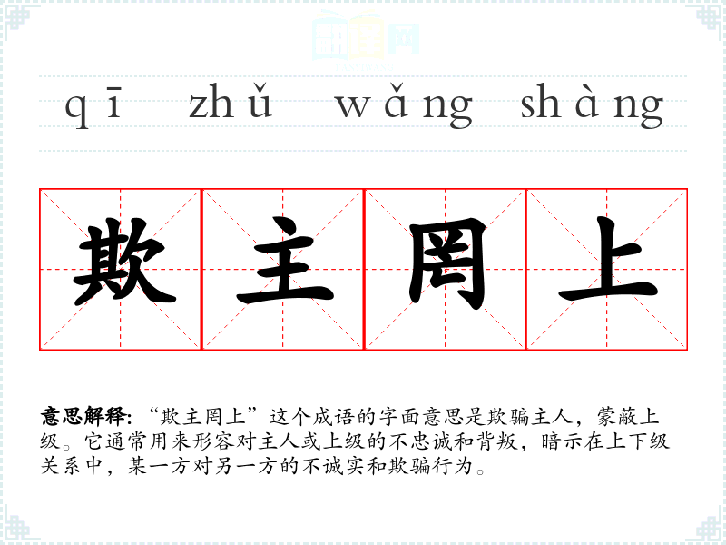“欺主罔上”这个成语的字面意思是欺骗主人,蒙蔽上级。它通常用来形容对主人或上级的不忠诚和背叛,暗示在上下级关系中,某一方对另一方的不诚实和欺骗行为。