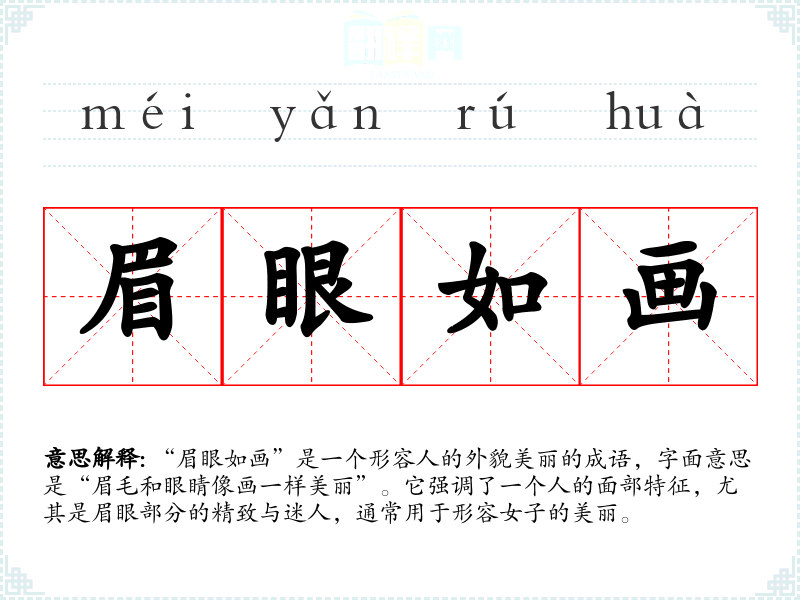 “眉眼如画”是一个形容人的外貌美丽的成语,字面意思是“眉毛和眼睛像画一样美丽”。它强调了一个人的面部特征,尤其是眉眼部分的精致与迷人,通常用于形容女子的美丽。