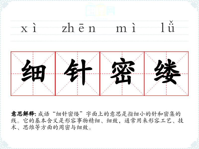 成语“细针密缕”字面上的意思是指细小的针和密集的线。它的基本含义是形容事物精细、细致,通常用来形容工艺、技术、思维等方面的周密与细致。