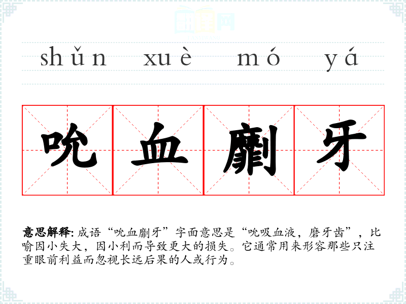 成语“吮血劘牙”字面意思是“吮吸血液,磨牙齿”,比喻因小失大,因小利而导致更大的损失。它通常用来形容那些只注重眼前利益而忽视长远后果的人或行为。