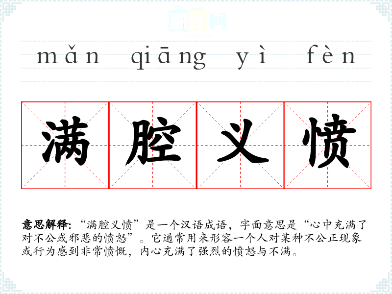 “满腔义愤”是一个汉语成语,字面意思是“心中充满了对不公或邪恶的愤怒”。它通常用来形容一个人对某种不公正现象或行为感到非常愤慨,内心充满了强烈的愤怒与不满。