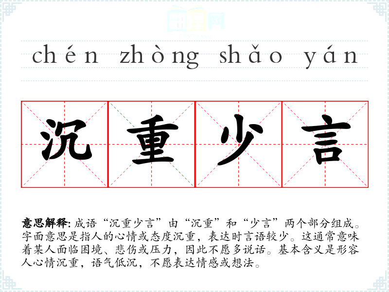 成语“沉重少言”由“沉重”和“少言”两个部分组成。字面意思是指人的心情或态度沉重,表达时言语较少。这通常意味着某人面临困境、悲伤或压力,因此不愿多说话。基本含义是形容人心情沉重,语气低沉,不愿表达情感或想法。