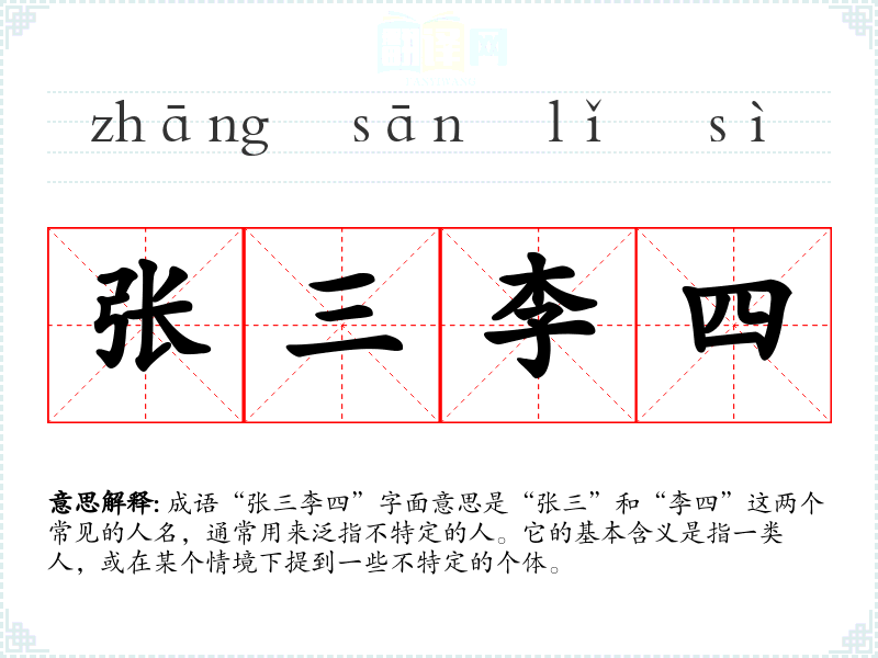 成语“张三李四”字面意思是“张三”和“李四”这两个常见的人名,通常用来泛指不特定的人。它的基本含义是指一类人,或在某个情境下提到一些不特定的个体。